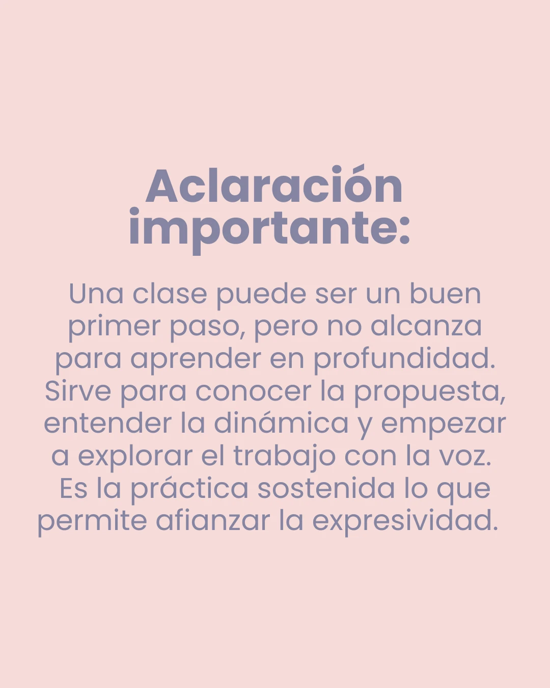 Aclaración importante: una clase puede ser un buen primer paso, pero no alcanza para aprender en profundidad. Sirve para conocer la propuesta, entender la dinámica y empezar a explorar el trabajo con la voz. Es la práctica sostenida lo que permite afianzar la expresividad.